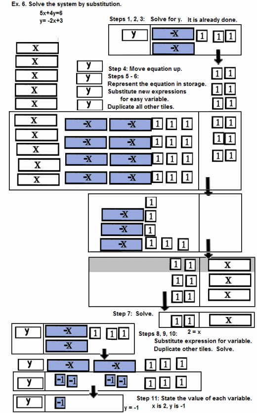 SUBSTITUTE, replace, each of the solved variable tiles with the expression found in the third step and
