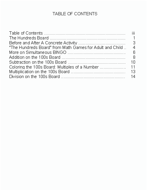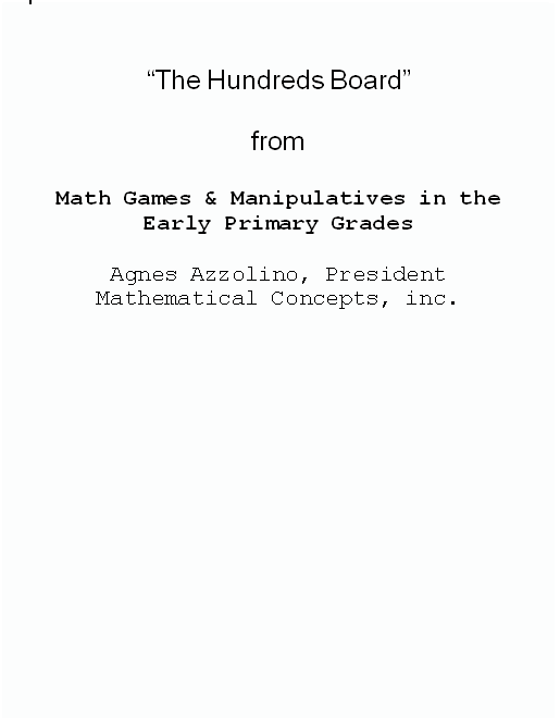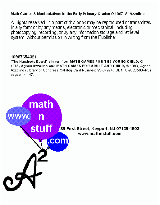 All rights reserved. No part of this book may be reproduced or transmitted in any form or by any means, electronic or mechanical, including photocopying, recording, or by any information storage and retrieval system, without permission in writing from the Publisher. "The Hundreds Board' is taken from MATH GAMES FOR THE YOUNG CHILD, © 1985, Agnes Azzolino and MATH GAMES FOR ADULT AND CHILD, © 1993, Agnes Azzolino (Library of Congress Catalog Card Number: 93-07994; ISBN: 0-9623593-4-3) pages 44 - 47. The text, “The Hundreds Board,” © 1997, Agnes Azzolino, ISBN: 1-929870-00-0, served as the source for these graphics of the original manuscript pages. See Cover, Inside Front Cover, pg. iii (Table of Contents), 1, 2, 3, 4, 5, 6, 7, 8, 9, 10, 11, 12, 13, 14, 15, 16. Additional resources are also provided. |