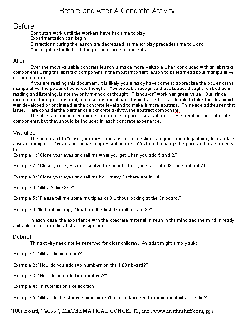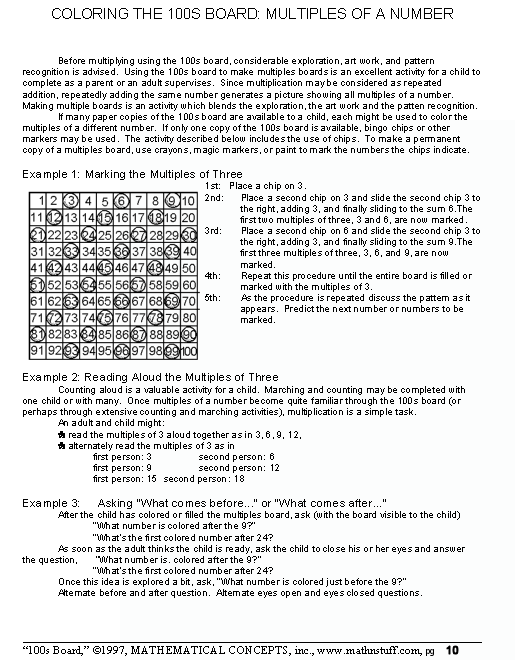 | Coloring the 100s Board ...................................................... Marking the Multiples of Three Reading Aloud the Multiples of Three Asking What Comes Before ..., What Comes After ... | 10 |