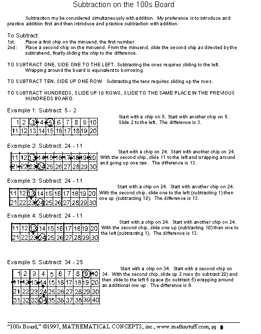 | Subtraction on the Hundreds Board .............................................. To Subtract 1, 10, 100 5-2, 24-11, 24-11 another way, 34-25 | 9 |