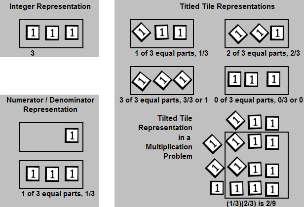 Tilted tiles are easier to use than Numerator / Denominator and they are used for easier problems. Just as fractions are more sophisticated than integers, Tilted Tile representation is more sophisticated than simple integer representation. With integer or algebraic representation, three unit tiles means three and the orientation of a tile has no meaning. With Tilted Tile fraction representation it could mean any of 4 different things and the orientation or tilt is critical to the meaning. The representations look VERY SIMILAR, so, it is CRUCIAL that one know what kind of work one is doing and the representation system used.