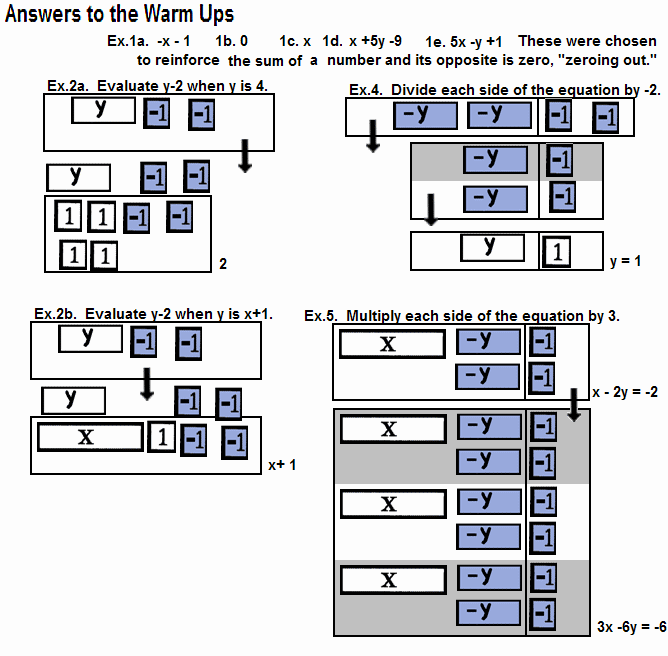 The reader is also reminded that manipulatives are made to be outgrown. Term Tiles should be secondary to mental and pencil and paper math. This is particularly true with multiplying none, one, or both equations by constant(s) in linear combination. Before solving an equation, do some warmup work.