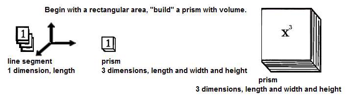 At the far right, start with the 0 dimension dot representing a point. Move left a distance marking a line of dimension 1 to record this path. Next drag the line segment up the page to record the path and mark the area, with 2 dimensions (length and width). Lastly, move the area up and off the page, sort of "stacking" the areas, to mark the 3 dimensional volume. The basic units of length are inch, meter, foot, rod, etc. The basic units of area are the squares of the basic units of length. The basic units of area must incorporate two dimensions, one of length and the other of width. The basic units of area are the square inch, the square meter, the square foot, the square rod, etc. The basic units of volume are the cubes of the basic units of length. The basic units of volume must incorporate three dimensions -- length, width, and height. The basic units of volume are the cubic inch, the cubic meter, the cubic foot, the cubic rod, etc.