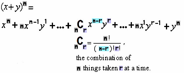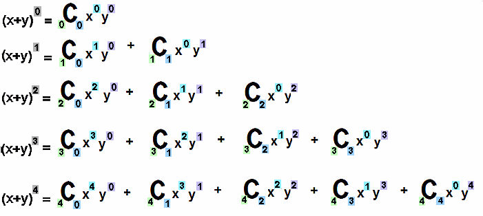 Extensive nonTile work has laid the foundation for this and the next pages. Combinations and different sets of numbers abound in the expansion of a binomial and Pascal's Triangle. Think of it as the "mile deep" background a teacher should have before the "inch or more wide" presentation of the binomial expansion. Because the next page presents warm-up, lesson, and summary, and extension on binomial expansion, this page serves only as a reference once the next lesson has begun. Think of this as the resource that will be used for the summary and extension of the next page. Without additional comment, the Binomial Expansion Presented Symbolically and Pictorially. The sum of two terms, x + y, raised to the 0, 1st, 2nd, 3rd, 4th, and 5th powers is stated below.