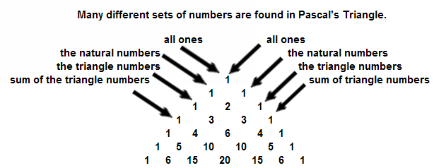 Many different sets of numbers are found in Pascal's Triangle. These include the natural numbers, triangle numbers, and the sum of the triangle numbers. See the page on "Sets of Numbers" for more info.