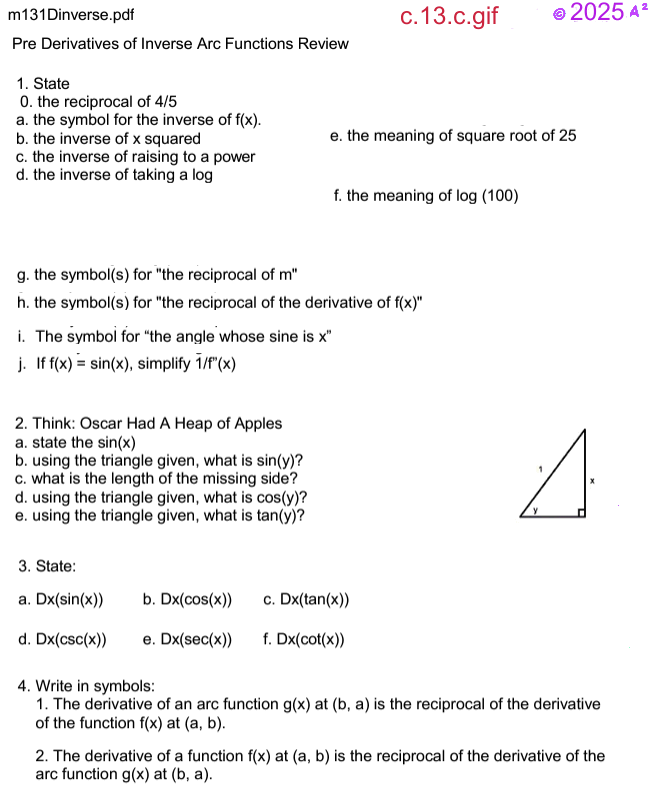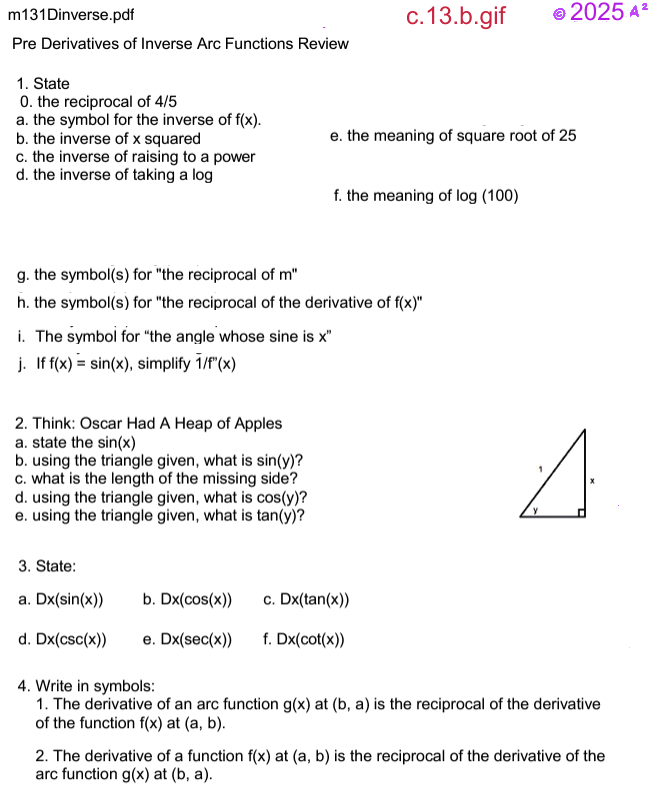 # 5. Pre Derivatives of Inverse Functions Review (also shown at the left)