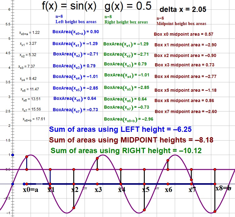 Intro2AntiDerivative.gsp ReimannSums.gsp -- n=8 and 32 LEFT, RIGHT, MIDPOINT slide [a,b] and set [a,b] ReimannSumNotes.pdf -- for taking notes | ||||||||||
