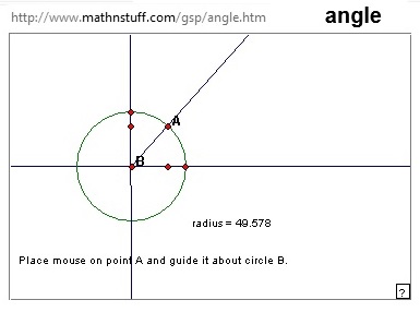 For years in precalc, I've been using Sketch Pad sketches that I've written. They're basic but VERY useful. They run on the web (see angle on the web) but not on my post-crash home computer (see angle on computer).