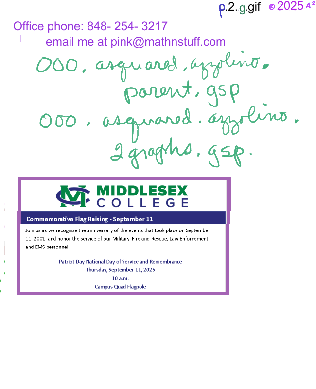 mathnstuff.com/math/precalc/MAT129fa25/p.2.htm © 2025 A2, Agnes Azzolino Quadratics, Solving Equations Algebraically; Graphing functions, domain, range, etc. Text 2.5, 2.6, PG. 119, 137 |