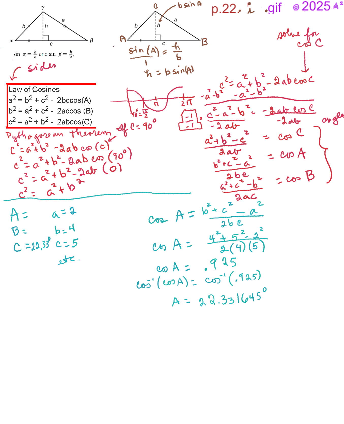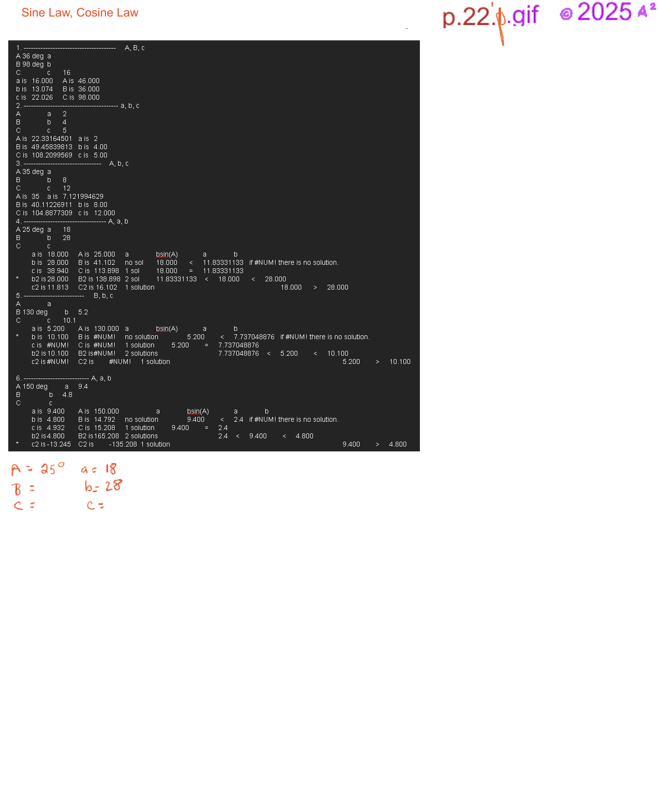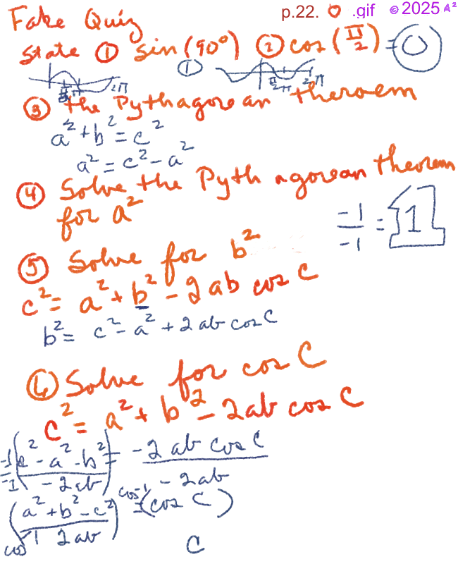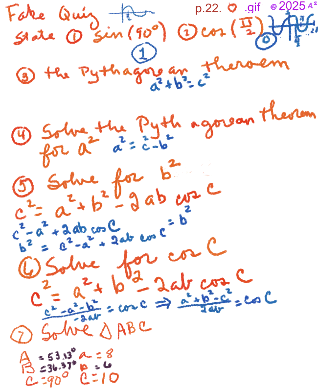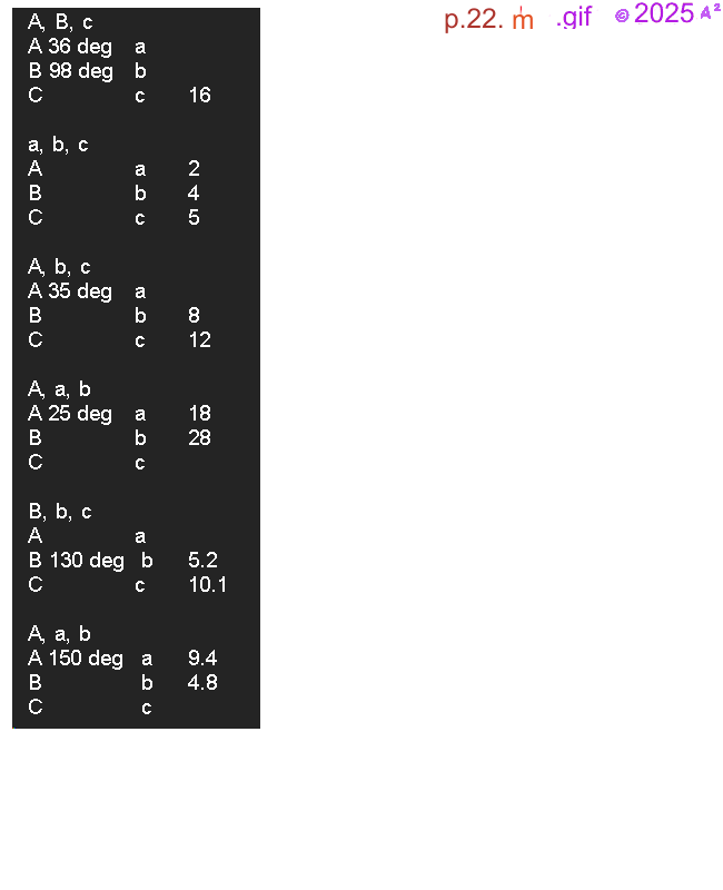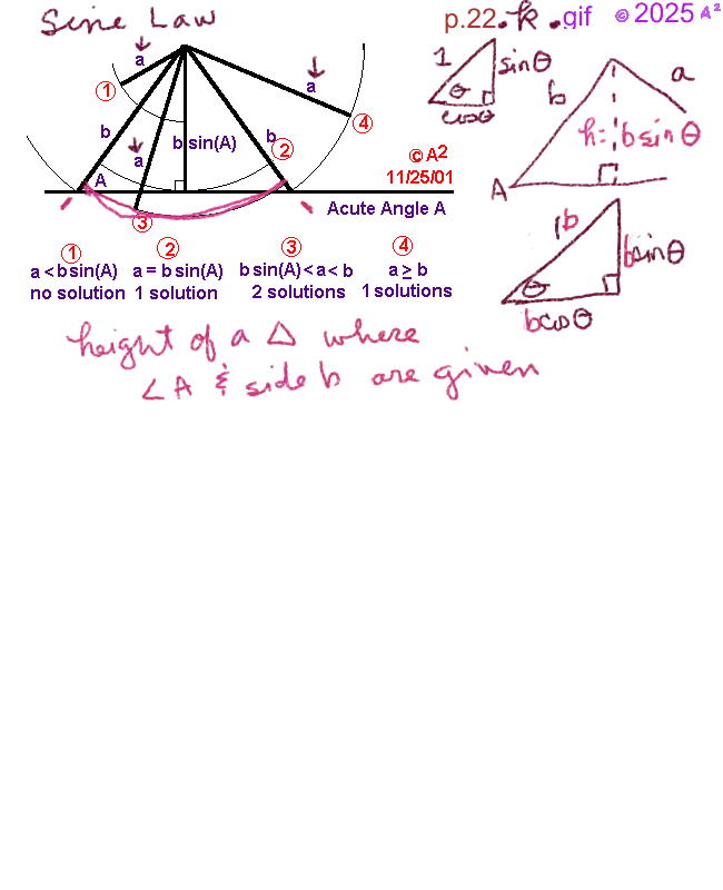 mathnstuff.com/math/precalc/MAT129fa25/p.22.htm © 11/25/2025 A2, Agnes Azzolino Law of Sines; Law of Cosines, Text 10.1, 10.2, PG. 762, 776 |