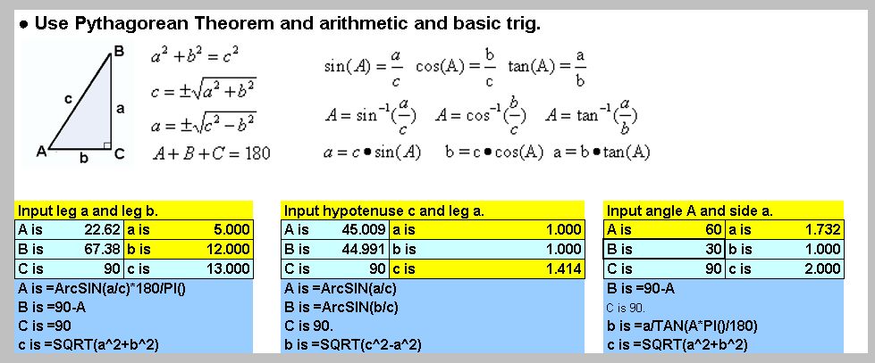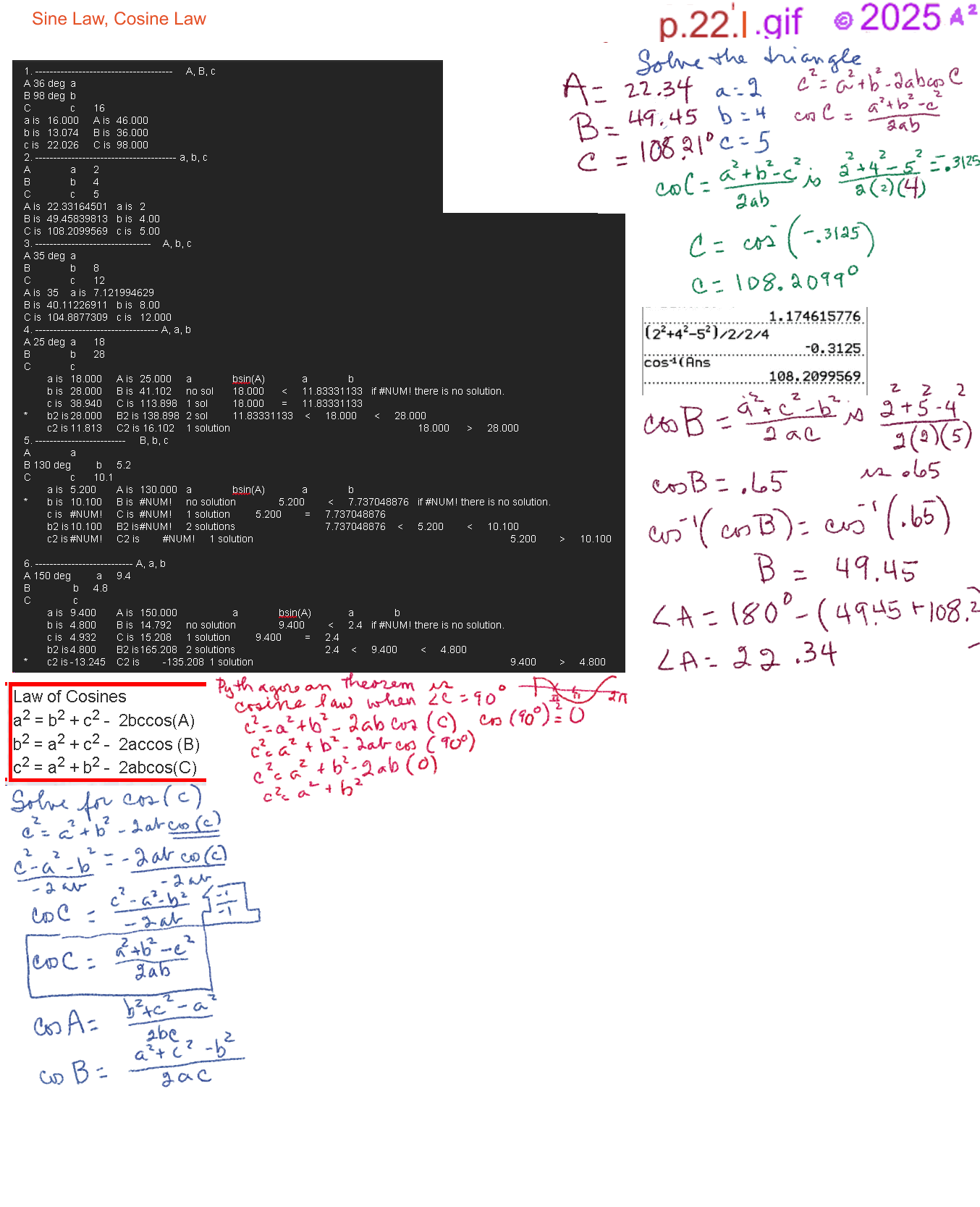 cos(B) = ( a2 + c2 - c2) / ( 2(a)(c) ) cos(C) = ( a2 + b2 - c2) / ( 2(a)(b) ) A = cos-1 [ b2 + c2 - a2) / (2(b)(c) ) ] B = cos-1 [ a2 + c2 - b2) / (2(a)(c) ) ] C = cos-1 [ a2 + b2 - c2) / (2(a)(b) ) ] |