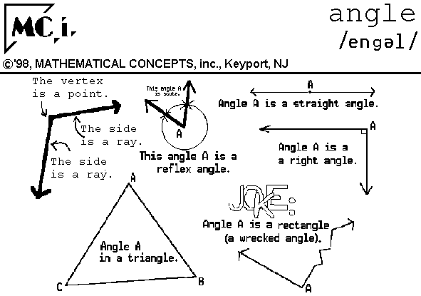 IN MATH: 1. n. the union of two rays with a common endpoint. EX. State the measure of a right angle.