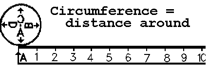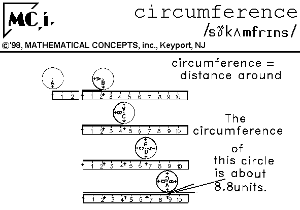 IN MATH: 1. n. the perimeter of a circle, the distance around a circle. EX. What's the circumference if the diameter is 12 yards?