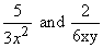 Ex. 5. Find the common denominator for 2/x2 and -3/(xy).| Common Factors First Each denominator has a factor of x. List it only once. Next list the two required factors of x and y. The common denominator is x·x·y or x2y. | | One Fraction At-A-Time The first fraction has denominator factors of x and x. List each. The next fraction has factors of x and y. Do not duplicate the x. List the y. The common denominator is x·x·y or x2y. |