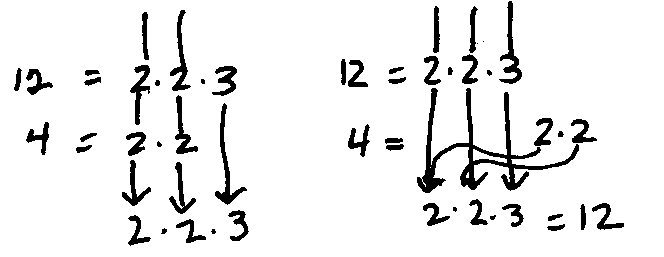 Ex. 1. Find the common denominator for 5/12 and 3/4.| Common Factors First The common factors are 2 and 2. The first denominator also has a 3. The common denominator is 2·2·3 or 12. | ![]() |