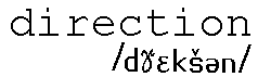 IN ENGLISH: 1. n. instruction. EX. Follow these directions and the job will be easy. 2. n. heading. EX. Our new direction will be northeast.
