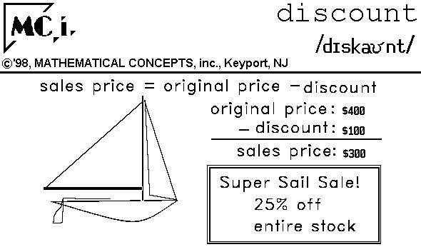 IN MATH: 1.n. amount not required to be paid. EX. I got a large discount because I was a union member.