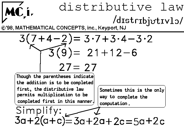 IN MATH: 1. n. A principal involving the operations of addition and multiplication which states: THE PRODUCT OF A NUMBER AND THE SUM OF TWO OTHER NUMBERS IS THE SAME AS THE SUM OF THE PRODUCTS OF THE NUMBER AND EACH OF THE ORIGINAL ADDENDS.