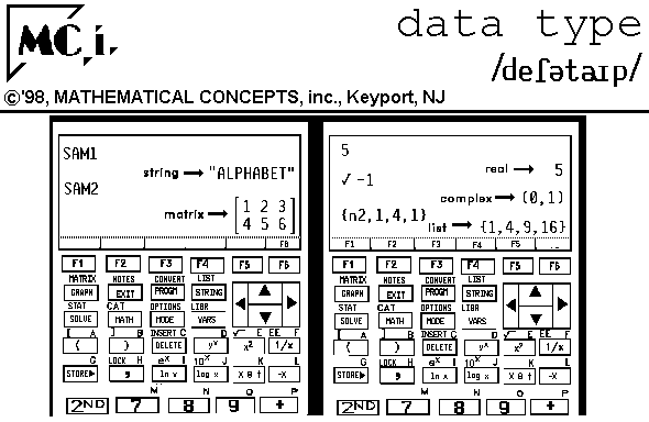 IN MATH: 1. n. in calculator or computer use, the kind or variety of object stored or required or used. EX. You can't sort a graph but can sort a list or string. Any of these data types may be stored.