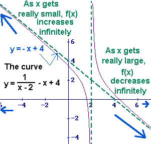 | EX. 3: When x is extremely large, the values of f(x) are close to the values of y = -x + 4, which is increasing infinitely, so, f(x) is increasing to positive infinitely. When x is extremely small, the values of f(x) are close to the values of y = -x + 4, which is decreasing infinitely, so, f(x) is decreasing to negaive infinity. |