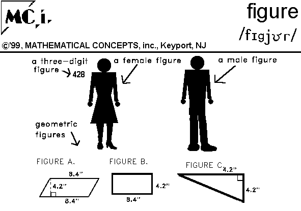 IN MATH: 1. n. a picture or illustration. EX. The figure was printed in black and red. 2. n. a number. EX. What figure did you get? 3. v. an idiom for to compute, solve, determine, "work out". EX. Can you figure this out?