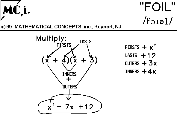 IN MATH: 1. n. a device for remembering the four multiplications required to compute the product of two binomials: First, Outer, Inner, Last.