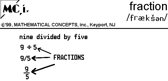 IN MATH: 1. n. a number written as the ratio of two numbers usually written in the form a/b, where b is not zero, and having the value of a divided by b; the ratio of the numerator to the denominator. EX. An im proper fraction may be changed to a mixed number. 2. as defined below.