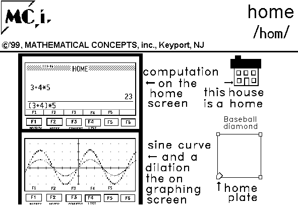 IN MATH: 1. n. a state, position, screen on a calculator which is the default location. Computation is often completed on the home screen. EX. Get out of the graphing screen and go home to do this computation.