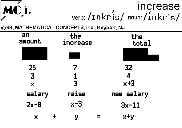 IN MATH: 1.n. an addition. EX. I'll take a pay increase any day.
