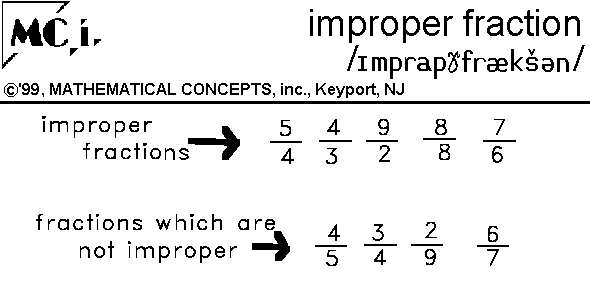 IN MATH: 1. n. a fraction having a numerator larger than or equal to the denominator.