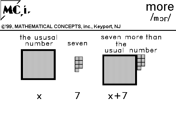 IN MATH: 1. in addition to. EX. I've got 7 more than usual. EX. We'll have to pay more for groceries now.