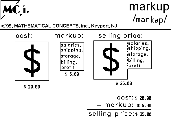 IN MATH: 1. n. in merchandizing, the amount above basic cost for which an item is sold. Nancy uses a rate of 50% to determine the markup on items she sells.