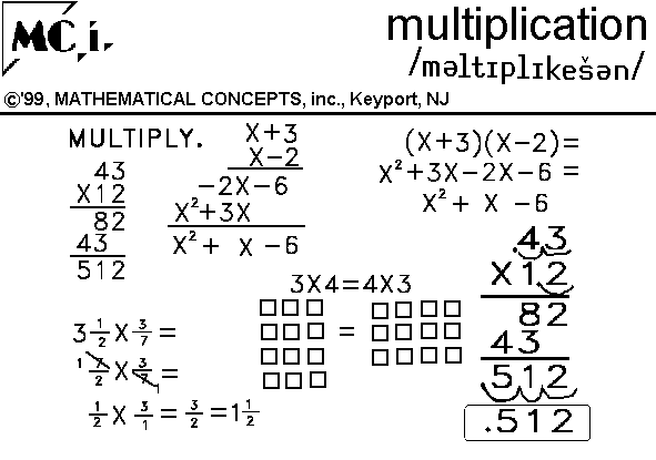 IN MATH: 1. n. operation on two numbers requiring the addition of one number (multiplicand) as many times as there are units in the other number (multiplier); procedure of finding a product; repeated addition.