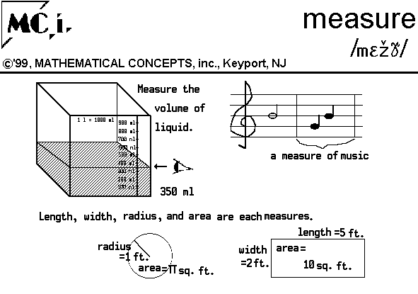 IN MATH: 1. n. dimension, capacity. 2. v. to determine capacity, area, volume, length by comparison with some unit. EX. He measured the rope in feet.