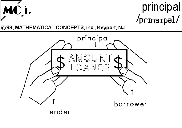 IN MATH: 1. n. in business, the amount lent or borrowed. EX. The principal of the loan was $4000. 2. a law, rule, property.