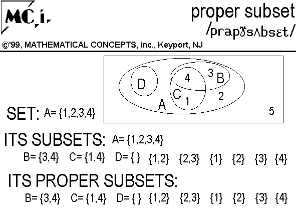 IN MATH: 1. n. a subset with some or none of the elements of the original set but with no new elements. EX. A set is not a proper subset of itself.
