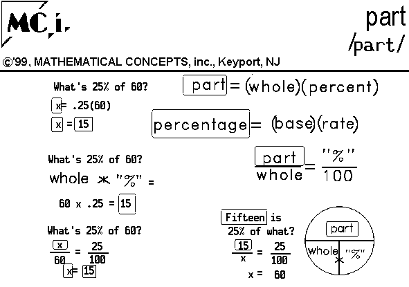 IN MATH: 1. n. piece; amount. 2. in percent problems, the part or piece; the product of the base and the rate. 3. v. to divide or separate. EX. I part my hair down the middle.