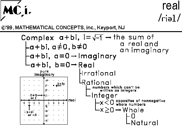 IN MATH: 1. n. a member of the set of naturals, wholes, integers, rational numbers, or irrational numbers. EX. The square root of negative one is not real. It is complex. See these numbers in a different format at: I Got Your Number.