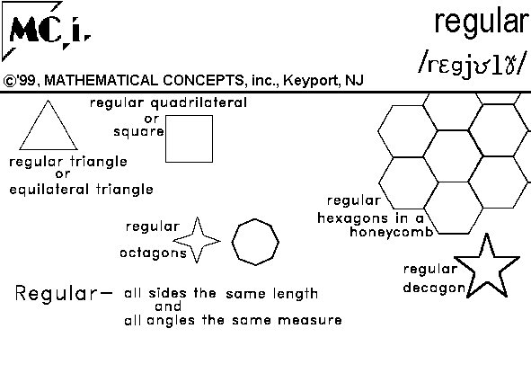 IN MATH: 1. adj. with polygons, equilateral and equiangular; having all sides and all angles congruent. EX. What is the angle measure of a regular triangle, an equilateral triangle?