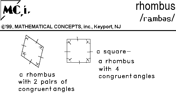 IN MATH: 1. n. a parallelogram having 4 congruent sides. EX. A square is a rhombus.