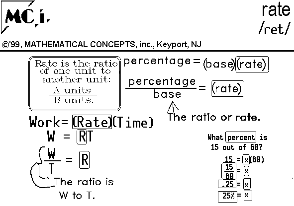 IN MATH: 1. n. a ratio or comparison of two unlike measurements, often distance or work compared to time. 2 .n. speed. EX. We traveled at a rate of 50 mph or 50 miles per hour.