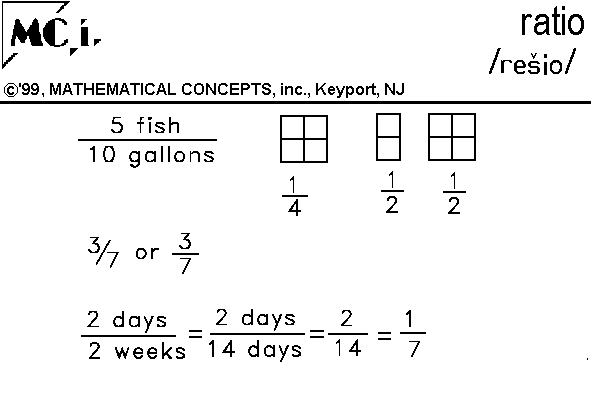 IN MATH: 1. n. comparison of two quantities or measures. EX. Unit cost is computed by simplifying the ratio of cost to unit.