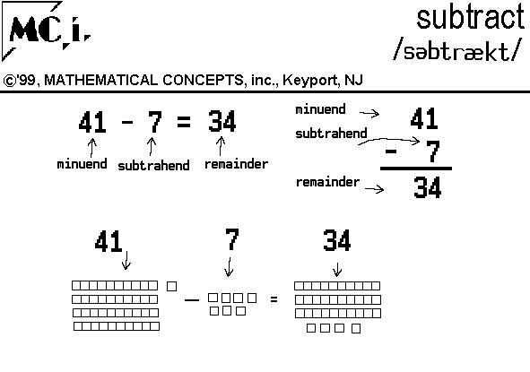 IN MATH: 1. v. to perform the operation of subtraction; to find the difference between two numbers.