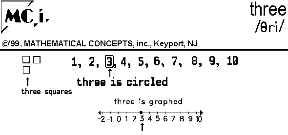 IN MATH: 1. n. natural number greater than two but less than four. 2. n. the second smallest prime number. EX. Triple a number means three times that number.
