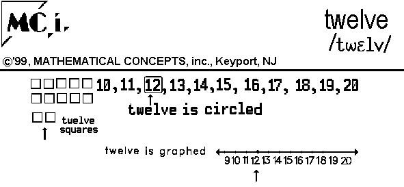 IN MATH: 1. n. 12, 10 + 2; ten plus two; the whole number less than thirteen but greater than eleven. EX. There are twelve in 1 dozen.
