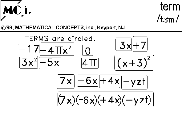 This is a page from the dictionary MATH SPOKEN HERE!, published in 1995 by MATHEMATICAL CONCEPTS, inc., ISBN: 0-9623593-5-1. This 460-entry book sells for $12.00 US plus shipping and sales tax.