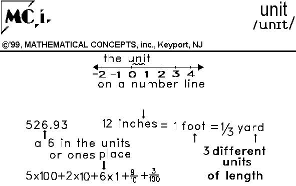 IN MATH:1. n. a standard or reference against which other things are compared. 2. 1; one. 3. the name of the first place to the left of the decimal.