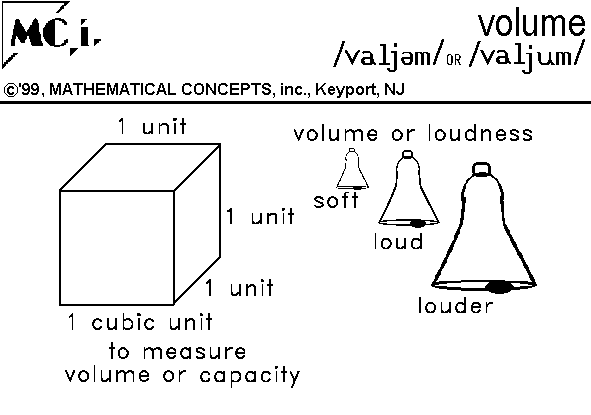 IN MATH: 1. n. measure of capacity; number of cubic units. EX. Compute the volumes of this cone and that prism. 2. n. measure of noise level. EX. Turn down the volume on that radio!