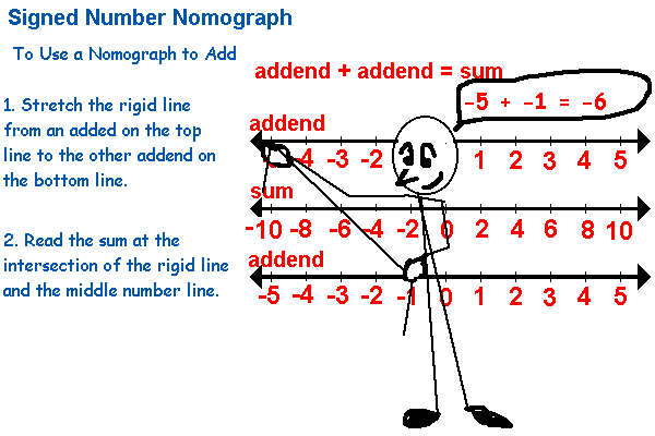 A nomograph is set of 3 equally-spaced parallel number lines and a 4th line or string used to set up and complete an addition or subtraction.