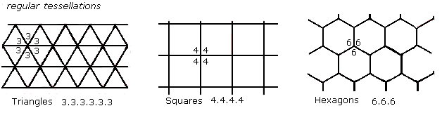 Regular tessellations are composed of triangles, 3.3.3.3.3.3, squares, 4.4.4.4, and hexagons, 6.6.6.